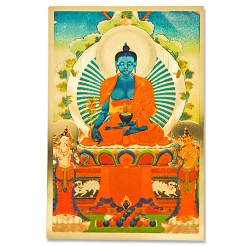 藥師琉璃光如來簡稱藥師佛,為東方淨琉璃世界之主。身如吠琉璃色,光明具足,著三法衣,右手作勝施印持帶葉的藥訶子(藏音阿如拉,意為藥王),左手托缽,缽內裝滿能治眾生一切疾病的甘露、妙藥,相好莊嚴,金剛跏趺坐於蓮花月輪上。