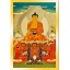 釋迦牟尼佛,釋迦意為能,牟尼意為仁,即能仁之意。誕生於西元前541年,出身印度無垢釋迦王族,父淨飯王、母摩耶夫人。年少即精通六十四種技藝,娶耶穌陀羅為妻,因感有情生老病死苦,於二十九歲時離家剃髮修行,於尼蓮禪河畔林中苦行六年,三十五歲四月十五日夜,降服眾魔、證悟成佛。八十一歲四月十五日於拘屍那伽圓寂。終其一生三轉法輪隨緣度眾,初於瓦納拉西轉四諦法輪,次於王舍城、靈鷲山,轉性相法輪及分別抉擇法輪。 圖中釋迦牟尼佛,身紫磨金色,著三法衣,相好莊嚴。右手觸地印、左手結定印持缽,雙足金剛跏趺座。兩旁協侍為阿難與大迦業尊者。