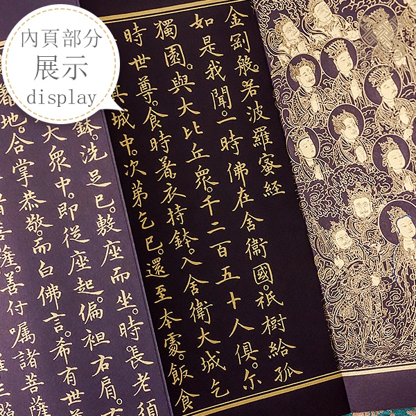《金剛經》傳入中國後,自東晉到唐朝共有六個譯本,明泥金寫本《金剛經》為鳩摩羅什所譯本。此經文書法精妙,賞心悅目,整齊嚴謹,略帶隸意。書中佛像以泥金描繪,畫工極為精美,筆法一絲不苟,充分展現纖筆細毫的繪畫功力。依此經修持能成就金剛不壞之本質,修得悟透佛道精髓智慧。十方法界的眾生,要修行成就佛菩薩,成就無上正等正覺,要經過金剛經的真修實證,開悟而後成就。據傳有避邪、鎮煞之功效,福德熏沐有緣人,為自用、餽贈最佳藝術紀念收藏品。