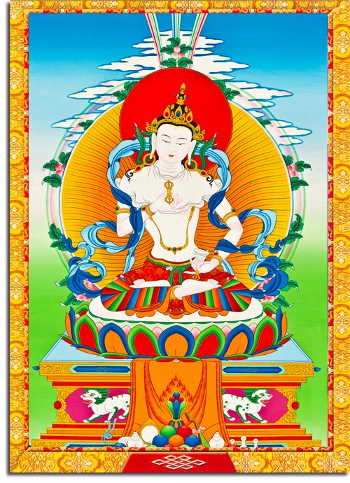 金剛薩埵,身潔白如晶,頭戴寶冠,束髮結髻,餘髮披肩,右手執五鈷金剛杵,置於心尖,左手執金剛鈴,安於左胯,著天衣彩裙,具足珠寶瓔珞等報身佛之一切莊嚴,以金剛雙跏趺姿安住於蓮花月輪之上。