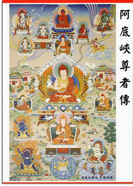 阿底峽尊者是朗達瑪王滅法之後,復興佛教的一位重要人物。尊者是薩霍爾國人,他的父親是善勝吉祥王。尊者到阿伐都帝尊者處修難行,學中觀,獲得月稱一派的中觀見。他遍學四部(大眾、上座、正量、一切有部)的三藏教典,通達各派的持戒法。他曾長久住在毗訖羅摩屍羅寺,主要依止那若巴尊者。又曾從飛行寺法護學《毗婆娑論》十二年。尊者不但精通了佛教學術,對於當時的其他學派:如正理派、數論派、勝論派、瑜伽派的根本經典都能通曉。