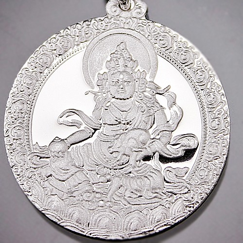 黃財神乃寶生佛的化現。身黃色,一面二臂,右手持聚寶果,左手握吐寶鼠。頭戴寶冠飾摩尼寶,著天衣、眾寶瓔珞以為莊嚴。雙足菩薩如意坐姿,右腳輕踩海螺上,安住於蓮花月輪座。黃財神屬密續中之作部,修習此法當以無上菩提心為本,發心利益有情,自然如願成就。可袪窮困之苦,增上順緣受用無慮。材質:純銀尺寸:項墜直徑約3cm,由於丈量方式的不同,因此尺寸可能有2%以內之誤差。● 由於拍攝技術影響與顯示器色差,實際物品與網路商品顏色可能略有不同,將以實際出貨商品為準