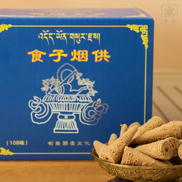 本108味煙供食子香採用藏密傳承的秘方,使用三白三甜(奶酪、牛奶、酥油、蜂蜜、冰糖、紅糖等)以及糌粑、綢緞、金銀、八寶、瑪瑙等108味精選食物香料,配以殊勝甘露法藥手工精製而成,內附聞解脫咒輪。