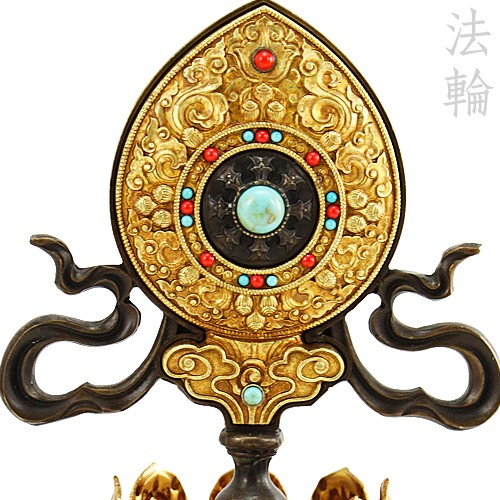 【法輪】在佛典上與修行的戒定慧三學有關:輪軸代表「戒」,藉著它,心始能持住穩定;輪輻代表「慧」,空性知識慧,以此斬除無明;而輪框則表示「定」,覺性與專注。也象徵佛法的圓融和完滿,它無始無終,剎那間可動可止,正代表法教的完整和圓滿,以及希望廣為宏揚之祈願。