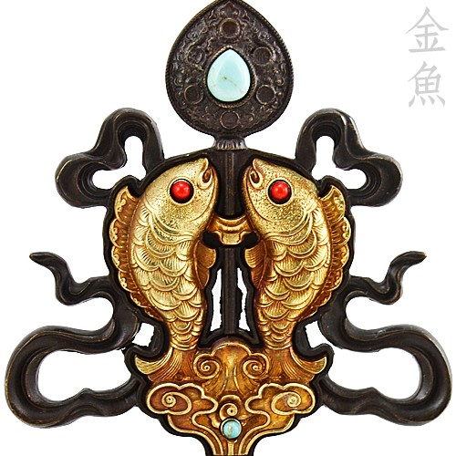 【金魚】以其自由遊於水中,象徵超越世間、自由闊達、得解脫的修行者。雙魚則表雙運解脫的境地,也象徵佛之慧眼。