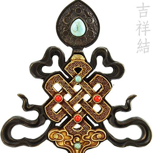 【吉祥結】又稱無盡意結,有連綿不斷之意。纏繞的線條代表一切現象的縱橫交錯,以及因緣之合合。由於一切現象都是依緣而生,因此常用在禮物或卡片上,象徵結緣以及吉祥之意;由於它無始亦無終,也象徵佛陀無邊的教法,以及無盡究竟的佛性。