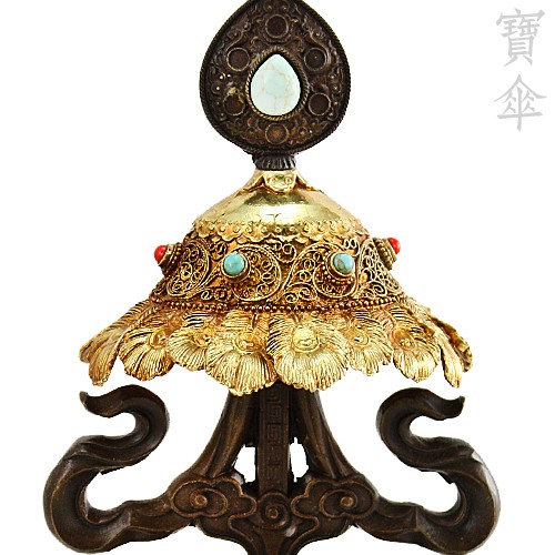 【寶傘】傘的原始作用在於遮陽、抵擋風雨、保護行人。因此也具有一種權勢和位階的象徵,在宗教上則被喻為一種「保護行者免受惱熱之害」,以及「守護佛法」之意,也象徵佛法之殊勝高貴。