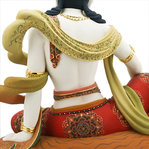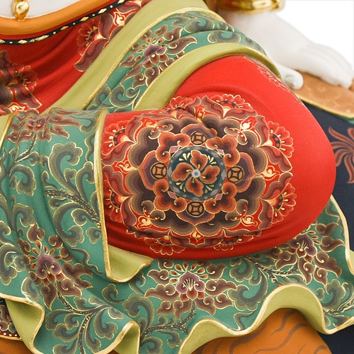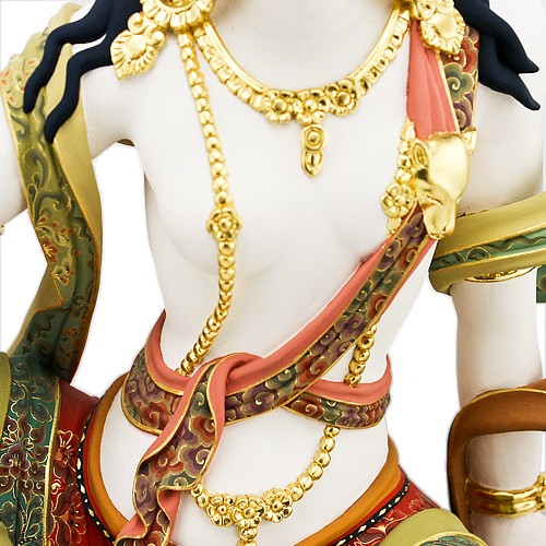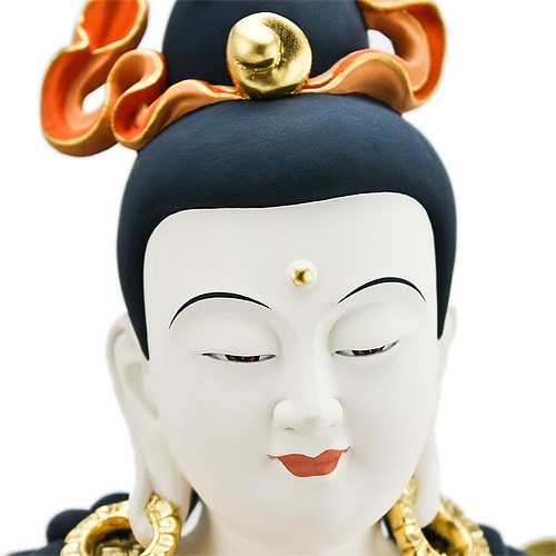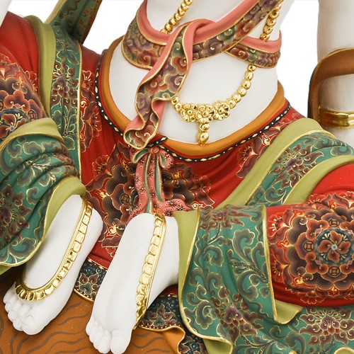 此尊樟木極彩獅吼觀音,一面二臂,身白色,身上披掛珍寶瓔珞,耳有環嚴飾,身姿略側,披著天衣,以國王遊戲姿,安然坐於一頭紅鬃毛的青獅上,獅背上鋪有獸皮坐墊,獅頭微向上迴轉側看,菩薩安住騎上,神色悠然自得,內具降伏三界之力,外相穩如泰山。