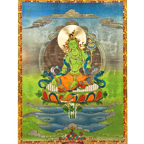 綠度母為觀世音菩薩悲心之化現,即經典中之多羅菩薩,其緣起摘錄如下:無量劫前,有世界名曰「聚光」,國中公主名般若月,生性仁慈悲憫有情,淨信三寶而發大願:自今起乃至世界盡、虛空界盡,願以女身度化有情。故成度母,名稱普聞於十方,佛所授記,真實不虛。 依度母本源記所載:觀世音菩薩於無量劫中,修行度化利樂有情,因感眾生秉性頑強度不勝度、而悲憫落淚,其淚滴化現成度母,道曰:〝汝勿憂悶,吾為汝助。眾生雖無量,吾願亦無量。"此為度母之由來。