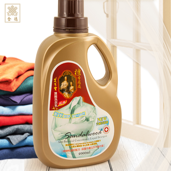 檀香濃縮抗菌洗衣乳是以Chlorhexidine Glucorate抗菌劑和多種去污配方再加入天然檀香精油研製而成,質純溫和,能徹底清除衣漬污垢,不傷玉手,不損布質,並可預先處理難洗的領口、袖口及襪底污垢,去除頑垢更方便有效。