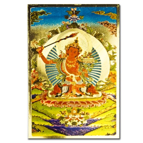 文殊師利,身桔紅,如旭日初昇,頭戴五佛冠,表五佛五智,頂作五髻,表內証五智,右手高舉般若燄劍,表斷一切無明、愚昧、昏黯。左手當胸作轉法輪印,並拈青蓮花梗,延手臂而上。花開齊於耳際,蓮瓣上平放著般若波羅密多梵匣,表般若智慧浩瀚如經典。一切珠寶瓔珞表其報身圓滿,以金剛雙跏趺姿安住於蓮花日輪上。